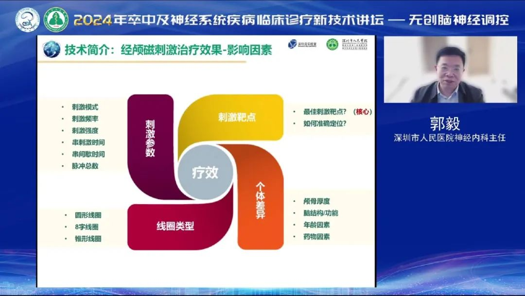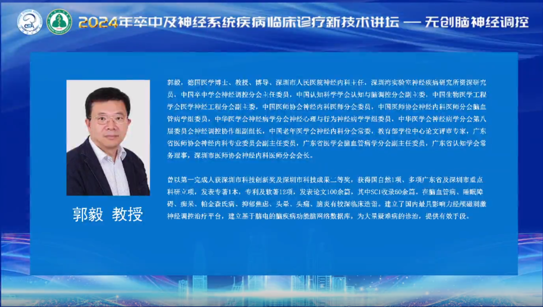 2024年1月22日晚20點,中國卒中學會神經調控分會特聯合深圳市人民醫院及“腦客中國”學術直播平臺,線上舉辦的公益講壇——2024年卒中及神經系統疾病臨床診療新技術講壇-無創腦神經調控,深圳市人民醫院神經內科郭毅主任作為第1位講者為大家帶來主題報告。