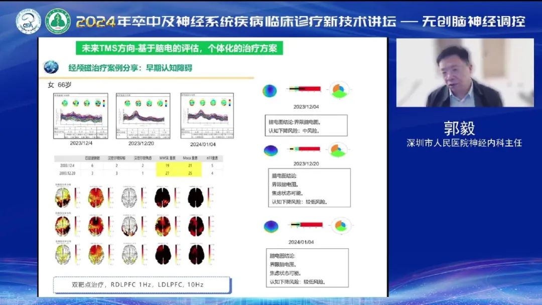 郭毅主任詳細介紹了一個治療病例:66歲女性在前兩家醫院診斷為癡呆。入院后進行腦電評估,結果提示認知下降為中風險,采用雙靶點刺激方案治療16天(1Hz RDLPFC+10Hz LDLPFC)。療程結束后,復查腦電發現患者腦電明顯改善,認知下降為較低風險,接近于正常,MMSE由16分到27分。