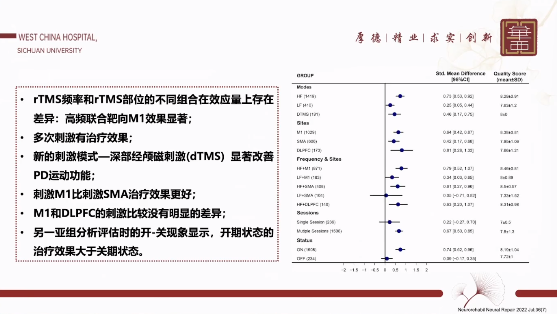 針對PD運動癥狀的改善,從刺激靶點來看,商教授著重講解了初級運動皮層(Primary motor cortex,M1)和輔助運動區(qū)(supplementary motor area,SMA),分別對不同治療范式對應(yīng)的運動癥狀改善做了介紹,同時通過一項薈萃分析說明rTMS與假刺激相比的改善情況。