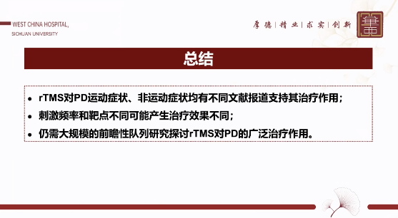 ①rTMS能夠調(diào)節(jié)中樞神經(jīng)系統(tǒng)單胺類神經(jīng)遞質(zhì)水平,增強突觸可塑性,促進(jìn)神經(jīng)生長,從而改善運動癥狀。對于非運動癥狀的改善,教授圍繞著抑郁和認(rèn)知兩方面展開敘述,刺激靶點著重于前額葉背外側(cè)以及M1區(qū)