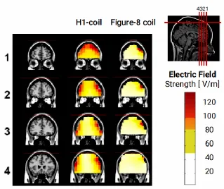 ▲H1線圈和8字形線圈感應的電場分布圖,基于在充滿生理鹽水溶液的模型頭中的測量結果。紅色像素表示高于神經元激活閾值(100V/m)的電場幅度。以120%閾值強度刺激時,H1線圈在1.8厘米深度處誘導超閾值電場,而8字形線圈可誘發超閾值電場的深度僅為0.7厘米。