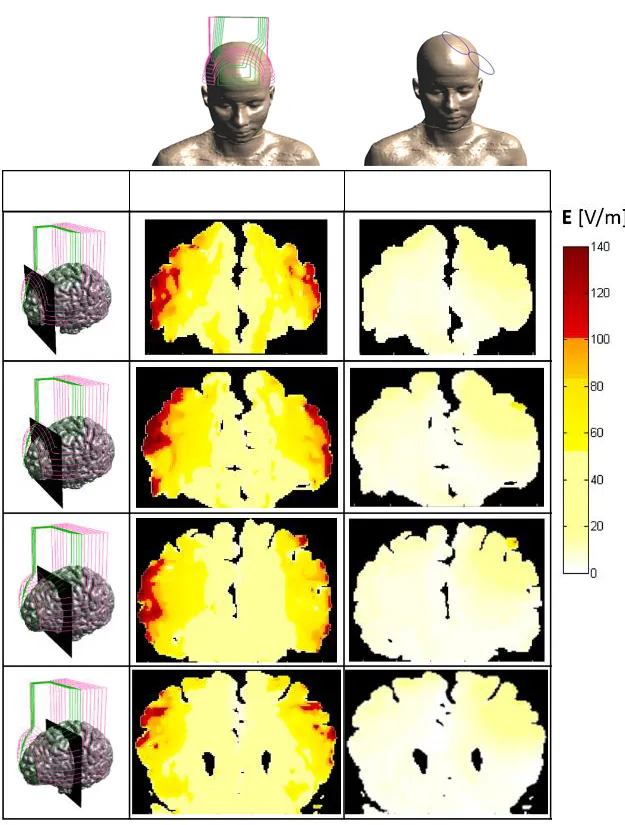 由于電場具有矢量性,偏離線圈焦點的非切向元件產生的磁場造成電荷大量聚集在頭皮,最終導致電荷無法向大腦深部傳導,降低了感應電場的穿透深度。