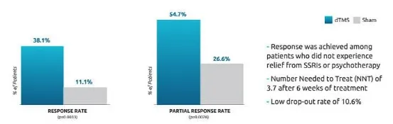 來自以色列、德國、美國、加拿大等國家的研究者開展了首項全球多中心雙盲對照研究,并發表于權威精神病學期刊《世界精神病學》。該研究于全球20個中心開展,共納入了233名抑郁癥患者,在4周的急性期治療內接受了20次dTMS治療,研究主要療效終點為21項漢密爾頓抑郁量表(HDRS-21)總分自基線至第5周的變化情況,次要療效終點為第5周時的有效/治愈率。