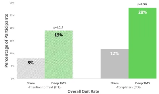 該研究針對H4 線圈進行一項前瞻性、雙盲、隨機、假對照臨床研究,證明了H4 DTMS系統具有有效輔助煙癮患者短期戒煙的效果。試驗納入多中心262名患者(患者對吸煙高度上癮,平均吸煙史超過26年,并且多次嘗試戒煙失敗),隨機分為兩組:試驗組,和設有一個假(安慰劑)對照組。治療每天進行,每周5天,持續3周,然后每周額外進行3次療程,持續3周(6周內共18次療程)。
