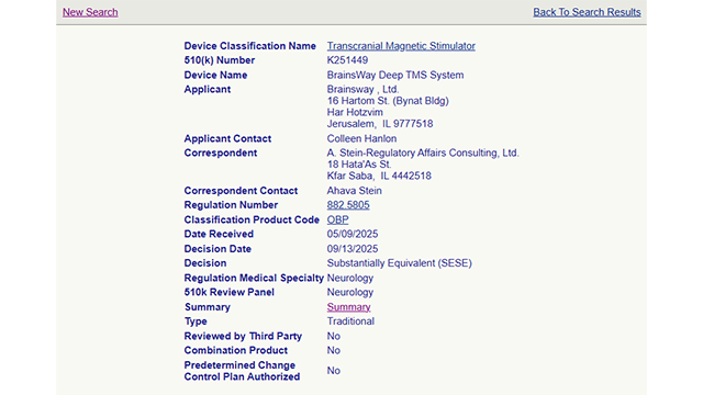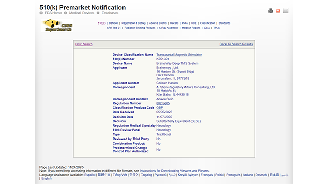 2025年11月,全球無創神經刺激治療領導者BrainsWay宣布:美國食品藥品監督管理局(FDA)已批準擴大其深部經顱磁刺激系統(Deep TMS?)的適用范圍,使該療法可作為針對 15 至 21 歲患有重度抑郁障礙(MDD)的青少年..