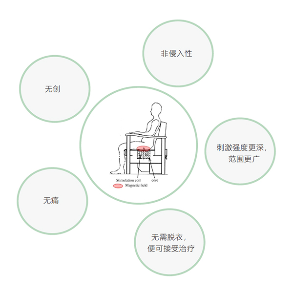盆底磁刺激技術(shù),通過運(yùn)動磁場的感應(yīng)電壓產(chǎn)生電流的刺激作用,刺激并激活盆底神經(jīng)產(chǎn)生神經(jīng)沖動,促進(jìn)盆底血液循環(huán),引起肌肉收縮,增強(qiáng)盆底肌肉的活性和力量,從而治療盆底功能障礙性疾病。與電刺激相比,無創(chuàng),無痛,更深更廣,更安全。