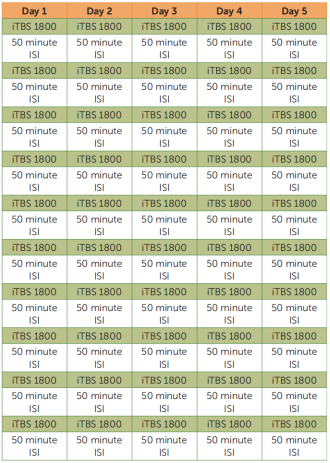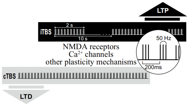 通過(guò)多年研究,最終確定TBS模式為:3個(gè)50Hz的爆發(fā)刺激為一叢或簇,叢或簇間以5Hz的間隔頻率刺激,總共600脈沖,刺激強(qiáng)度為80%AMT。當(dāng)連續(xù)刺激時(shí),持續(xù)時(shí)間為40秒(600個(gè)脈沖),稱(chēng)為連續(xù)爆發(fā)刺激或“cTBS”,該模式刺激會(huì)分別在刺激后導(dǎo)致MEP和皮質(zhì)脊髓活動(dòng)的LTD樣減少并持續(xù)20或60分鐘。相反,間歇性爆發(fā)刺激(iTBS)中連續(xù)刺激2s,間歇8s,總共600脈沖,用時(shí)190s。該模式導(dǎo)致MEP大小和興奮性的顯著LTP樣增加,持續(xù)20分鐘。[2][3]