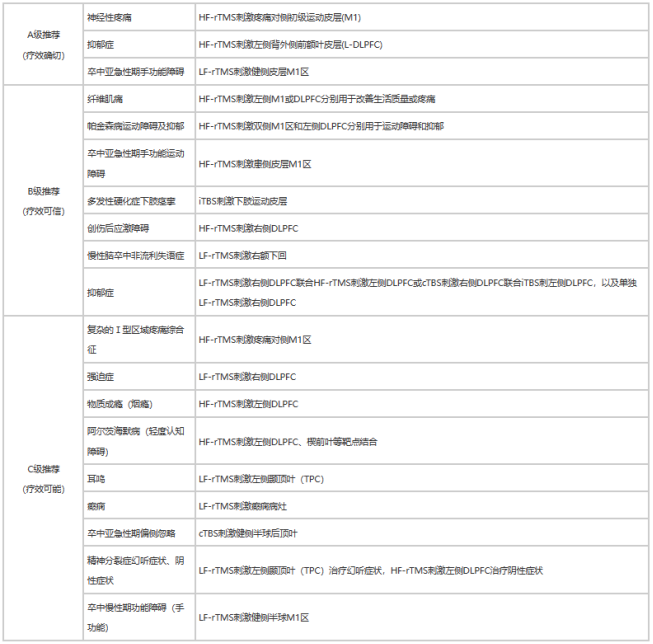 除了正在進(jìn)行的臨床試驗(yàn),美國(guó)食品和藥物管理局FDA)對(duì)經(jīng)顱磁刺激治療相關(guān)適應(yīng)癥的批準(zhǔn)也為臨床應(yīng)用奠定了基礎(chǔ)。這里我們回顧了FDA對(duì)經(jīng)顱磁刺激治療批準(zhǔn)的相關(guān)適應(yīng)癥以及國(guó)際臨床神經(jīng)生理學(xué)聯(lián)盟(IFCNrTMS臨床治療指南中的推薦適應(yīng)癥。