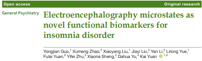 2.Reference:?Guo, Y., Zhao, X., Liu, X., Liu, J., Li, Y., Yue, L., Yuan, F., Zhu, Y., Sheng, X., Yu, D., & Yuan, K. (2023). Electroencephalography microstates as novel functional biomarkers for insomnia disorder.?General psychiatry,?36(6), e101171. https://doi.org/10.1136/gpsych-2023-101171