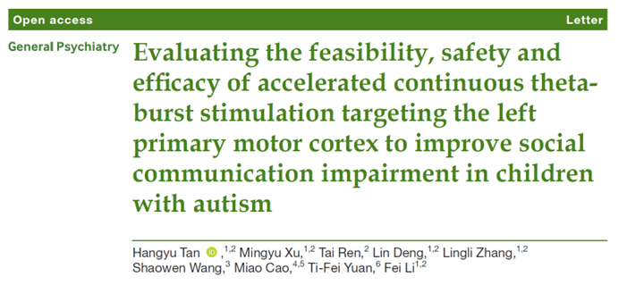 This study verified the feasibility, safety, and efficacy of a-cTBS targeting the left primary motor cortex (M1) in improving social communication impairment (SCI) in children with Autism Spectrum Disorder (ASD). The improvement was also associated with enhanced language abilities, suggesting that M1 may serve as a potential therapeutic target for ASD. The findings of this study were published in April 2025 in the journal General Psychiatry (IF = 6.8).