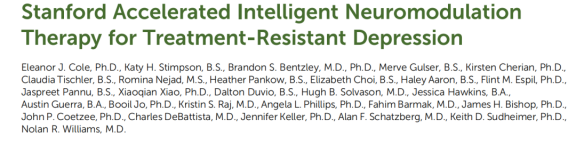 Cole, E. J., Stimpson, K. H., Bentzley, B. S., Gulser, M., Cherian, K., Tischler, C., … Williams, N. R. (2020). Stanford Accelerated Intelligent Neuromodulation Therapy for Treatment-Resistant Depression. American Journal of Psychiatry, appi.ajp.2019.1. doi: 10.1176/appi.ajp.2019.19070720