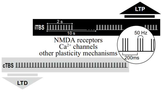 Through all these research over many years, the fnal TBS protocol of rTMS in humans involved the application of three bursts of 50?Hz stimulation, delivered at an interburst interval frequency of 5?Hz and an intensity of 80% AMT. When applied continuously, for a period of 20 or 40?s (300 or 600 pulses), known as ‘continuous’ theta burst stimulation or ‘cTBS’, this led to an LTD-like reduction in MEP size and corticospinal activity lasting for up 20 or 60?min, respectively, after stimulation. Conversely, an intermittent pattern of stimulation (known as ‘intermittent’ theta burst stimulation or ‘iTBS’), in which 600 pulses are delivered in 2?s trains of theta burst stimulation repeated every 10?s for 20 cycles (a total of 190?s), led to signifcant LTP-like increases in MEP size and excitability for up to 20?min.[2][3]
